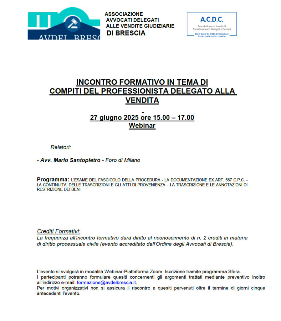 INCONTRO FORMATIVO IN TEMA DI COMPITI DEL PROFESSIONISTA DELEGATO ALLA VENDITA